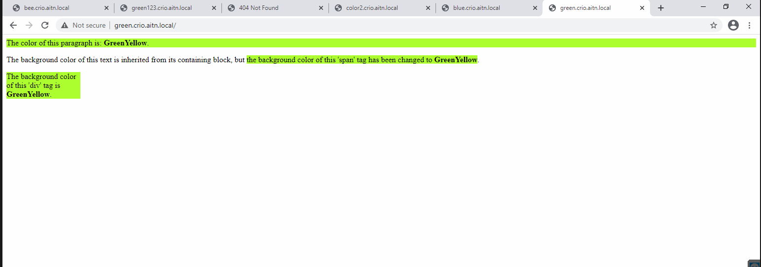 1- You should have create DNS records in your name server pointing to any of the cluster nodes to use with ingress. I have already configured a sub domain in my DNS to test the connectivity. I will be running two pods, Green, and Blue, each has a static web page that returns a color.