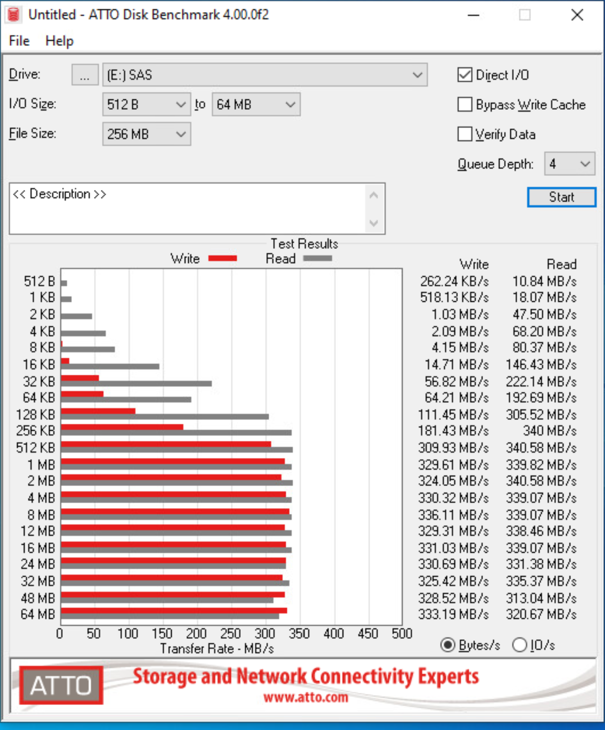 1- SAS storage tier: In this test I will use a Windows 10 machine with the storage testing utility ATTO Disk Benchmark installed on it. This VM is hosted on a standalone ESXi host, not in a vSAN cluster.