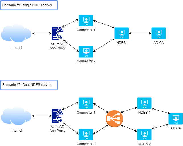 Node: if you are using Microsoft Intune as your MDM solution, then you don’t really to deploy this architecture as Intune has the capability of load-balancing the traffic accross multiple NDES servers (via Azure App Proxies)